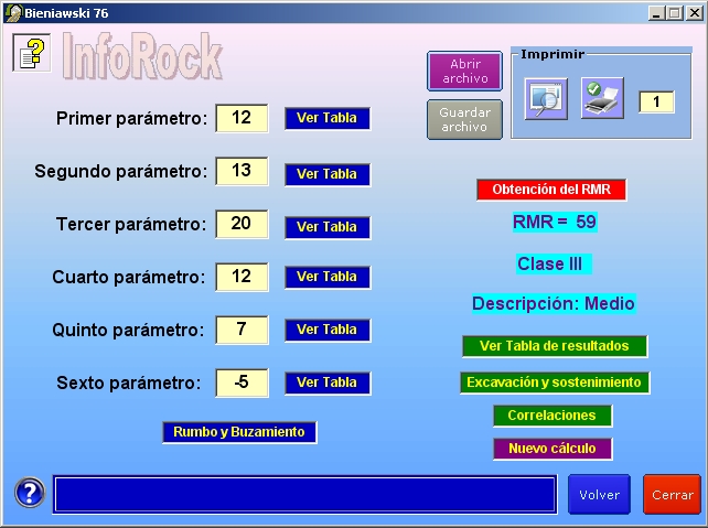 Se presentan los índices de clasificación siguientes: RMR propuesto por Bieniawski (1976, 1989), el índice de calidad Q de Barton (1974, 1993) y el de Laubscher (1976, 1984). Según los valores de estos índices, se puede estimar para un túnel u obra subterránea el sostenimiento más adecuado en cada caso. La elección del sostenimiento según el RMR se realiza directamente a partir de la tabla de Bieniawski para la excavación de túneles en roca. Según la clase de macizo rocoso, que depende del valor del RMR, se propone el método de excavación y el tipo de sostenimiento; éste podrá estar constituido por pernos de anclaje repartido, hormigón proyectado y cerchas de acero. Si se utiliza el índice de calidad Q de Barton para estimar el sostenimiento de un túnel, hay que calcular el valor de la dimensión equivalente, que se define como el cociente entre el diámetro, anchura o altura del túnel y el parámetro ESR. Este parámetro figura en las tablas de la clasificación y depende de la naturaleza de la obra. Según los valores de Q y de la dimensión equivalente, se proponen 38 tipos distintos de sostenimiento. Ambos programas también pueden determinar el valor del RMR una vez obtenido el índice Q o viceversa, mediante varias correlaciones. De esta forma se puede comparar el tipo de sostenimiento recomendado por una u otra clasificación y analizar qué factores tienen más influencia en caso de utilizar el índice Q o el RMR. El diseño del sostenimiento según la clasificación geomecánica de Laubscher se realiza basándose en el índice RMR de Bieniawski ajustado según la meteorización de la roca, tensiones de campo e inducidas, cambios tensionales debidos a la propia explotación, tipo de excavación, orientación respecto a la estructura geológica y efectos de la voladuras. Una vez clasificado el macizo rocoso se obtiene el tipo de sostenimiento según el índice de calidad de la clase ajustada y sin ajustar, o bien se puede definir la aptitud de un yacimiento mineral para ser explotado por hundimiento.