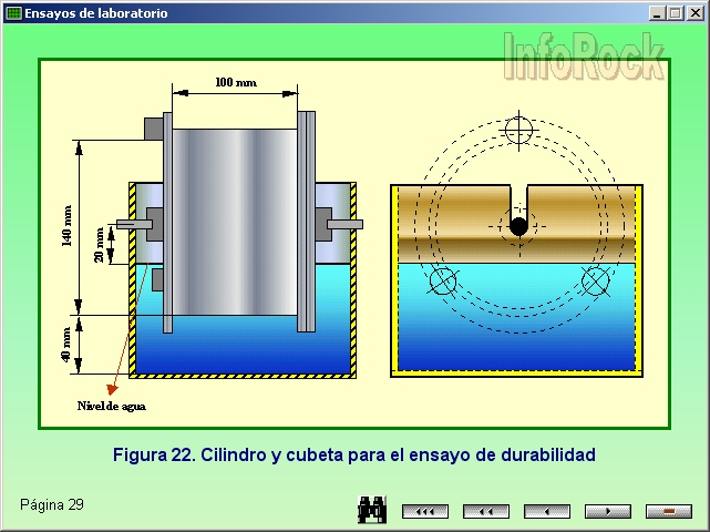 La durabilidad de la roca se obtiene mediante un ensayo en el que se determina la resistencia de la roca a la alteración y desintegración al estar sometida a dos ciclos sucesivos de inmersión en agua y secado. Contenido - ENSAYO DE DURABILIDAD Figura 22: Cilindro y cubeta para el ensayo de durabilidad