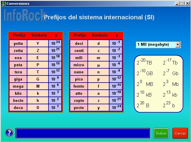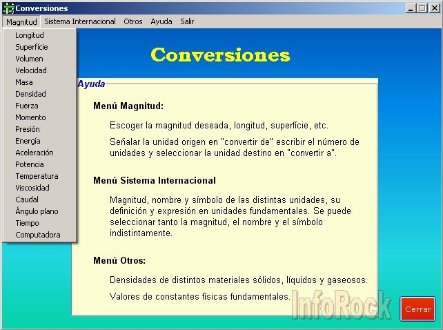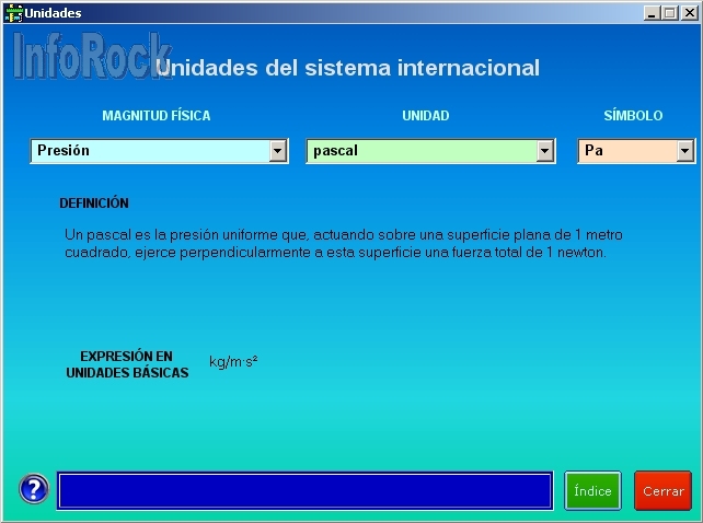 Comprende 18 magnitudes distintas: longitud, superficie, volumen, velocidad, masa, densidad, fuerza, momento, presión, energía, aceleración, potencia, temperatura, viscosidad dinámica, caudal, ángulo plano, tiempo y computadora. Descripción de las distintas unidades del Sistema Internacional, definición y expresión en unidades básicas. Prefijos (hecto, kilo, mega, etc). Densidades y constantes físicas fundamentales.