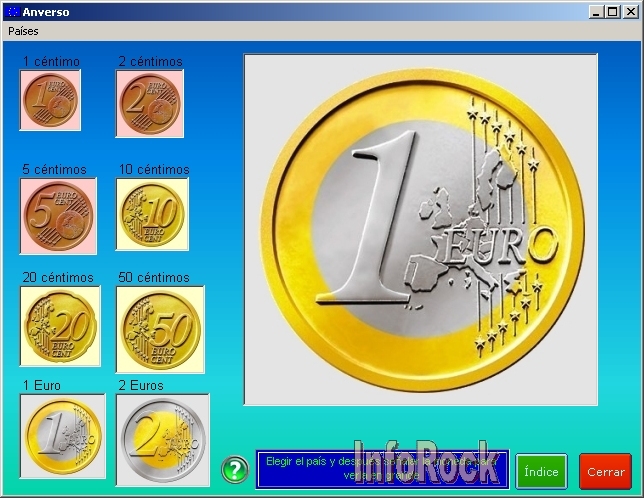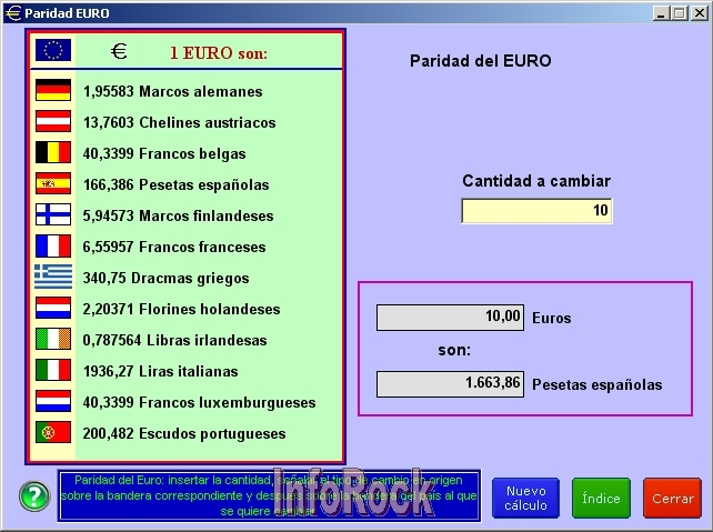 Paridad del Euro; cambio del Euro con las divisas de los doce países que lo han adoptado, así como el cambio entre sus antiguas monedas. Cambio entre el Euro y otras monedas que no lo han adoptado (dólar USA, libra esterlina, yen japonés y corona sueca). Galería de imágenes de las monedas y billetes de Euro.