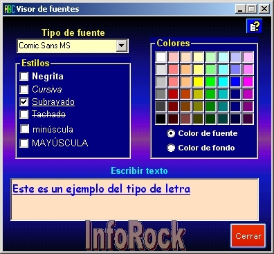 Vista preliminar de los distintos tipos de letra instalados en su ordenador, pudiendo aplicar distintos estilos y color de fuente.